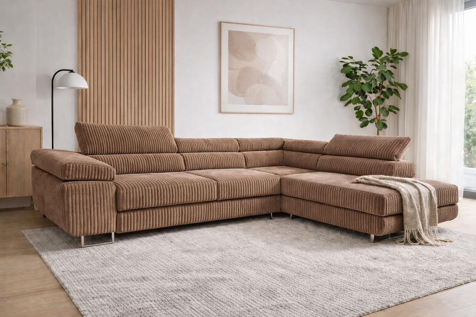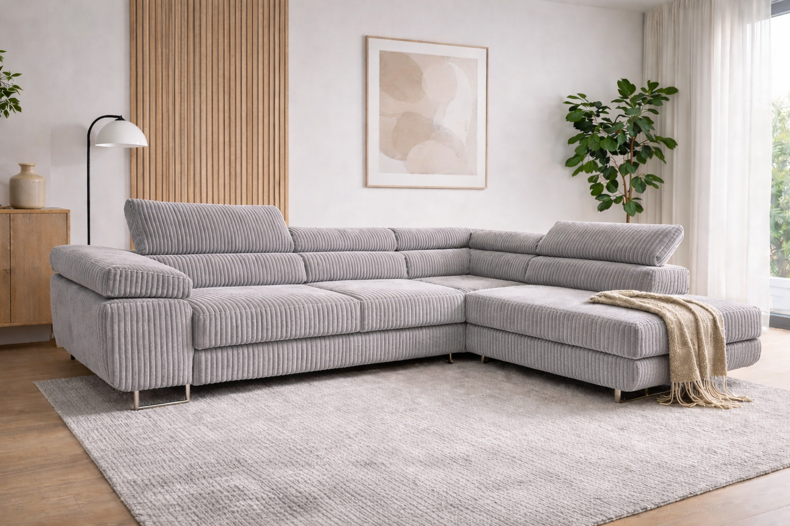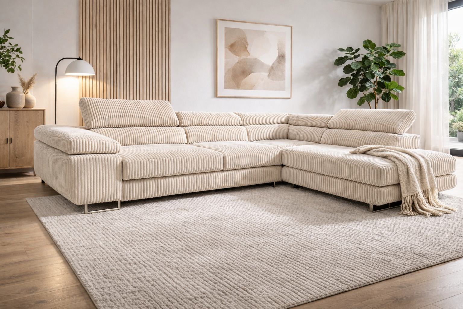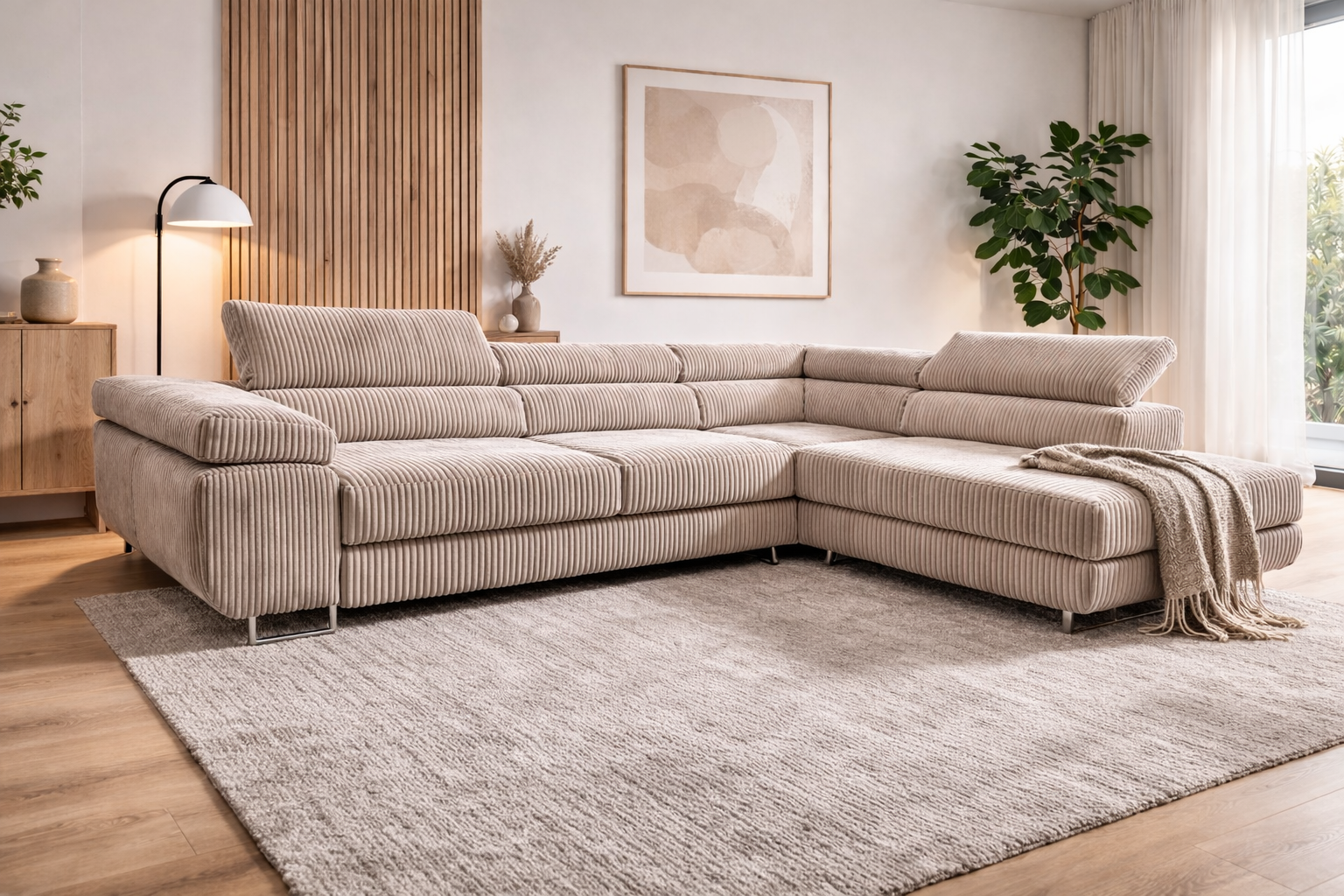 Pragniesz stworzyć w salonie strefę prawdziwego relaksu? Twój nowy narożnik ze Sztruksu ANTON (273x203 cm) w kształcie litery L to gwarancja wygody. Ten elegancki narożnik z zagłówkami o regulowanym kącie nachylenia idealnie dopasuje się do Twoich potrzeb.