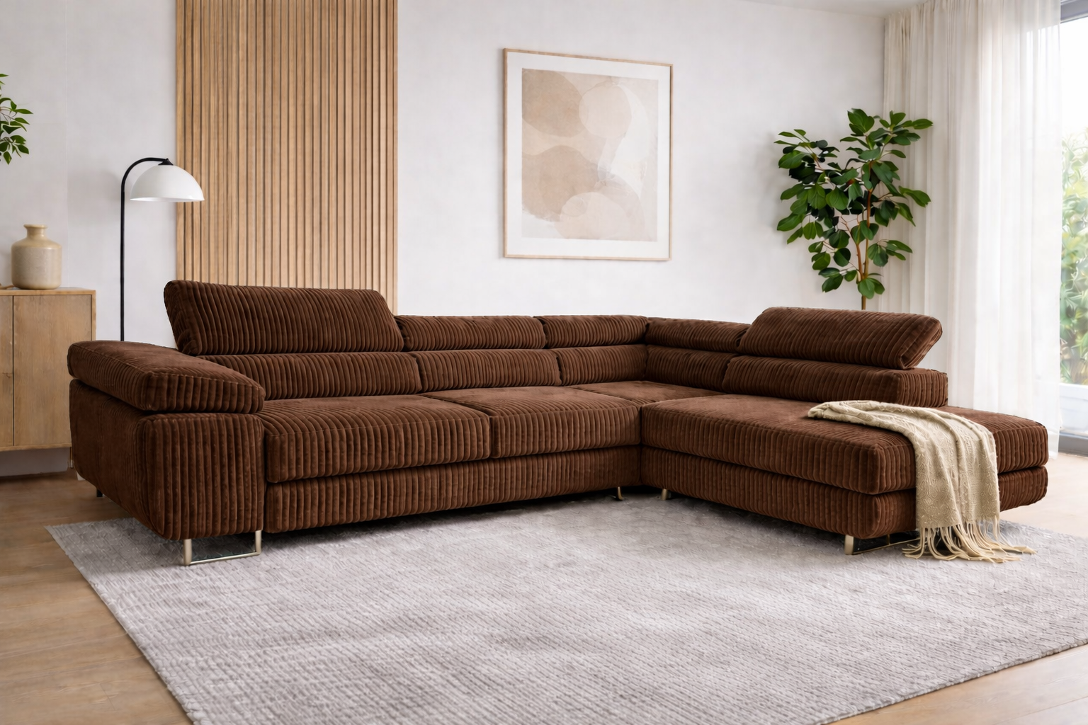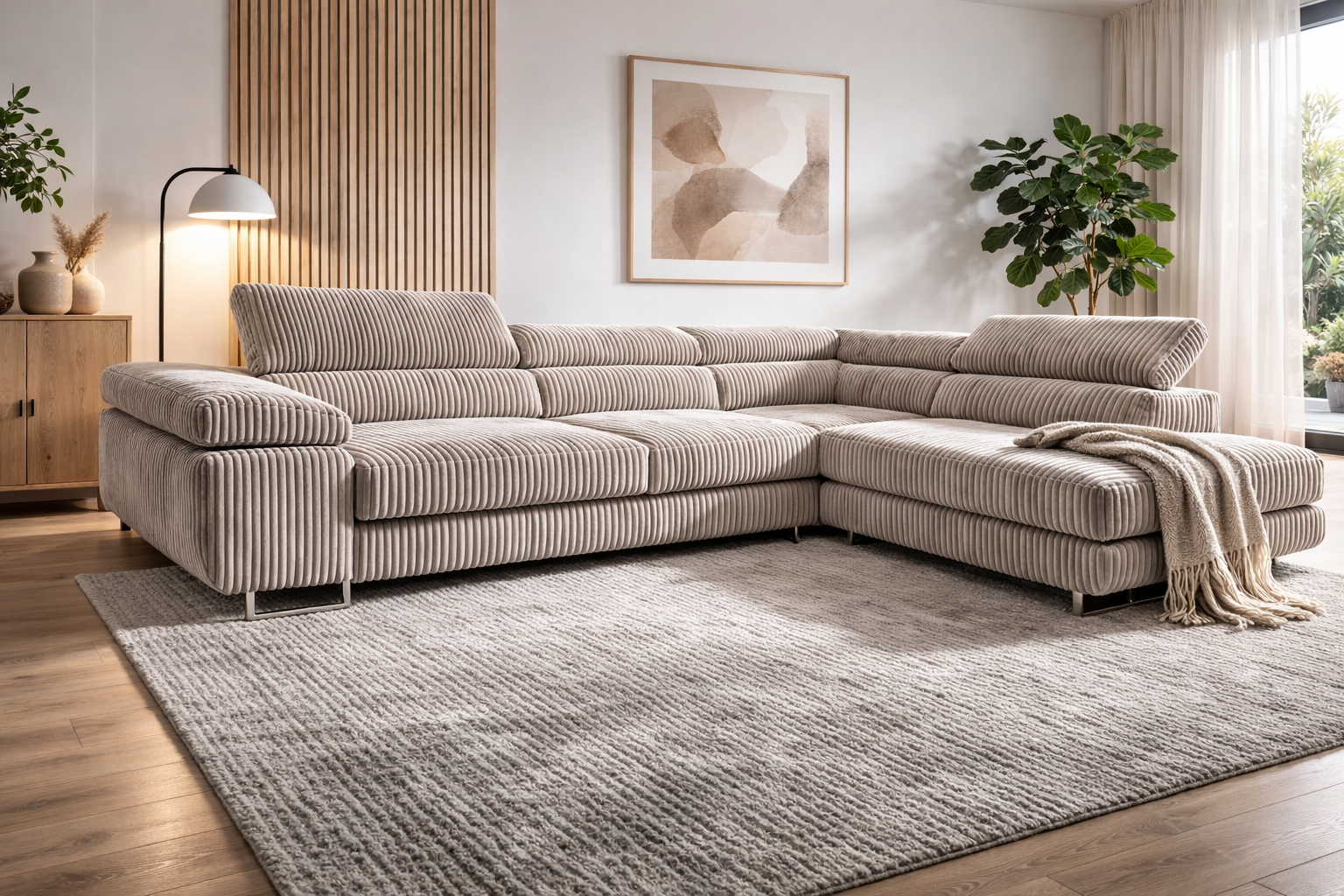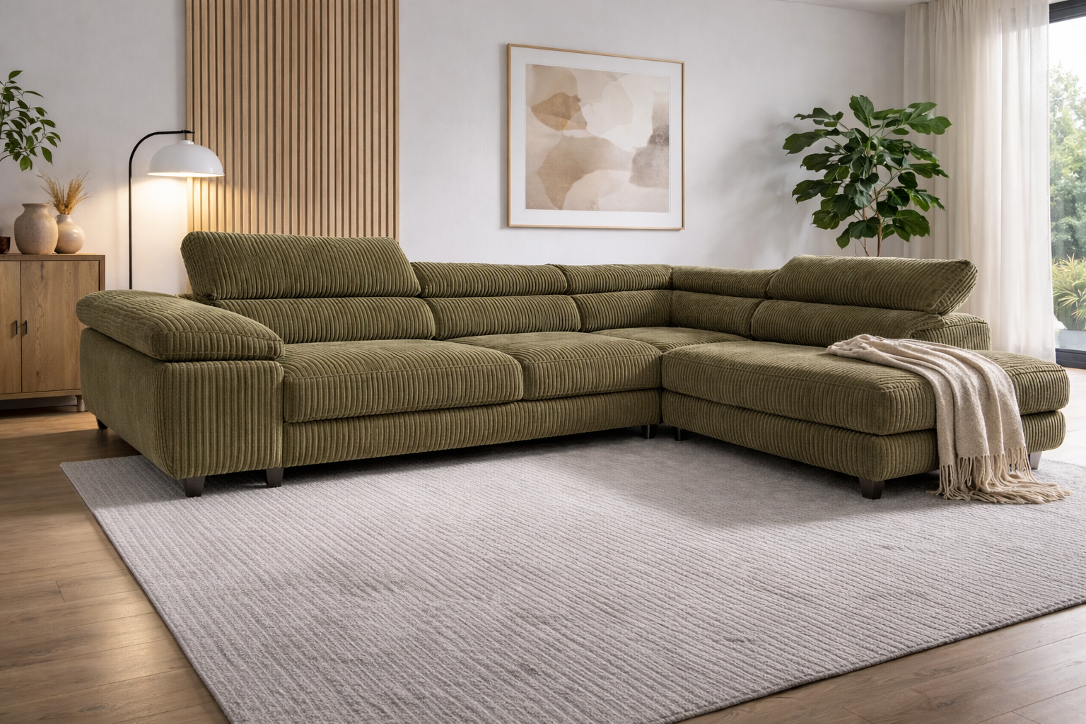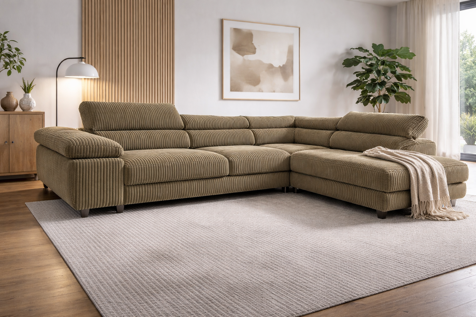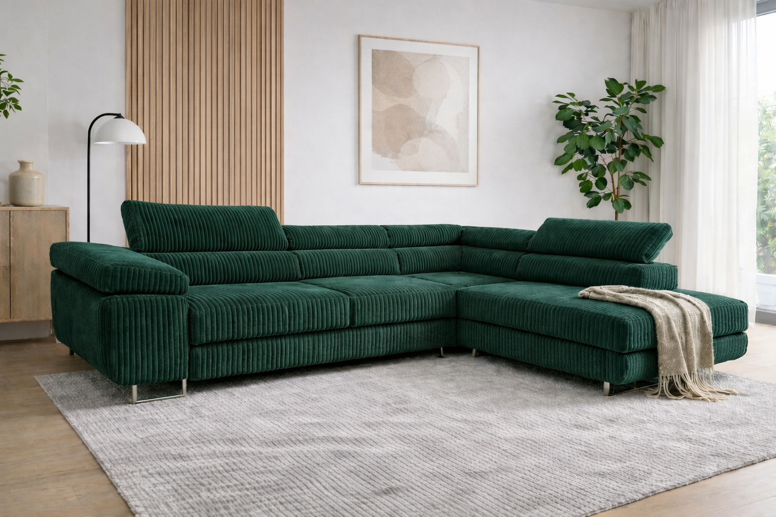 Pragniesz stworzyć w salonie strefę prawdziwego relaksu? Twój nowy narożnik ze Sztruksu ANTON (273x203 cm) w kształcie litery L to gwarancja wygody. Ten elegancki narożnik z zagłówkami o regulowanym kącie nachylenia idealnie dopasuje się do Twoich potrzeb.