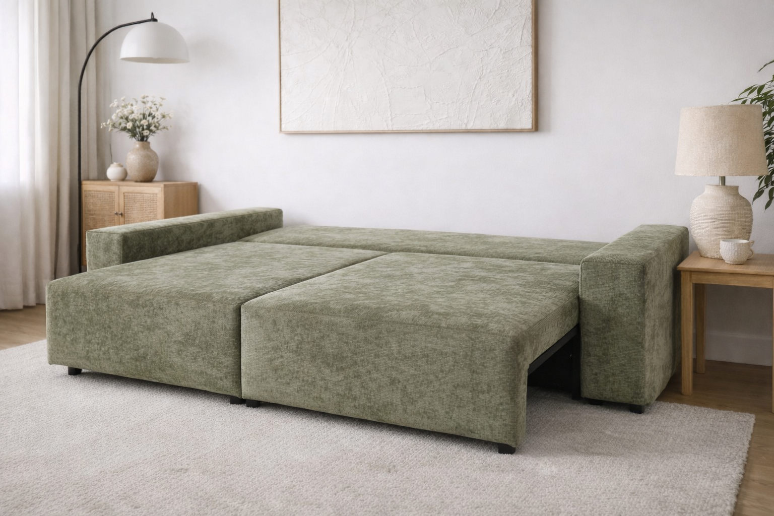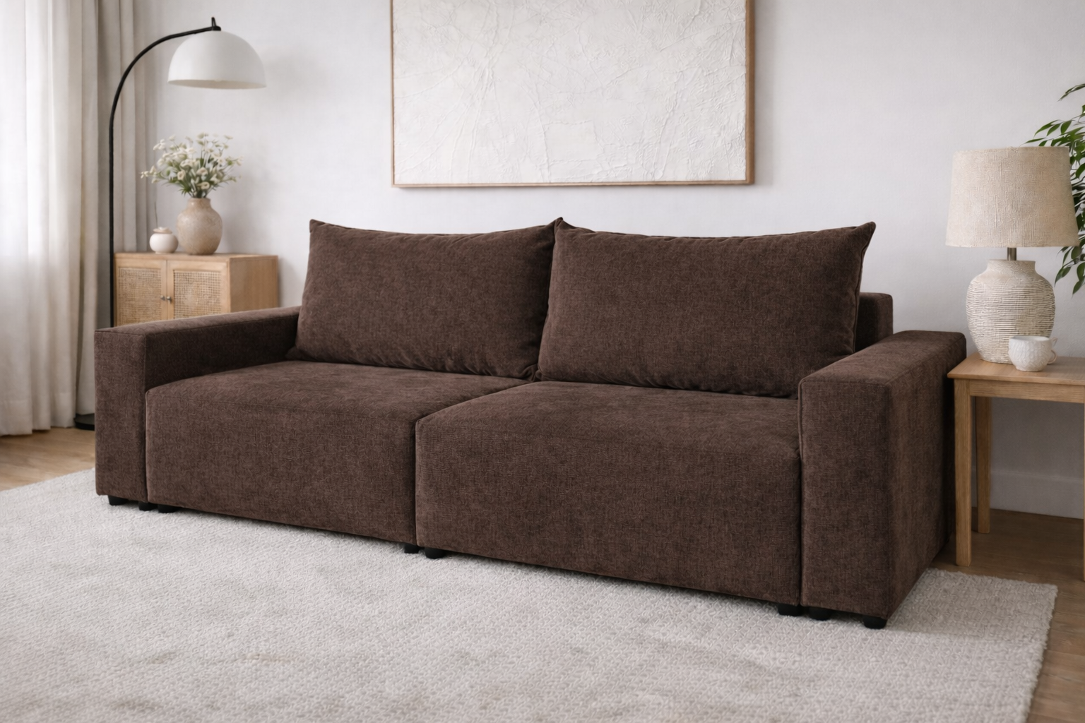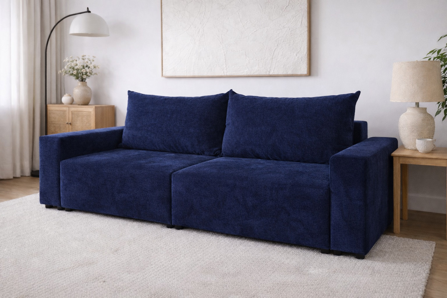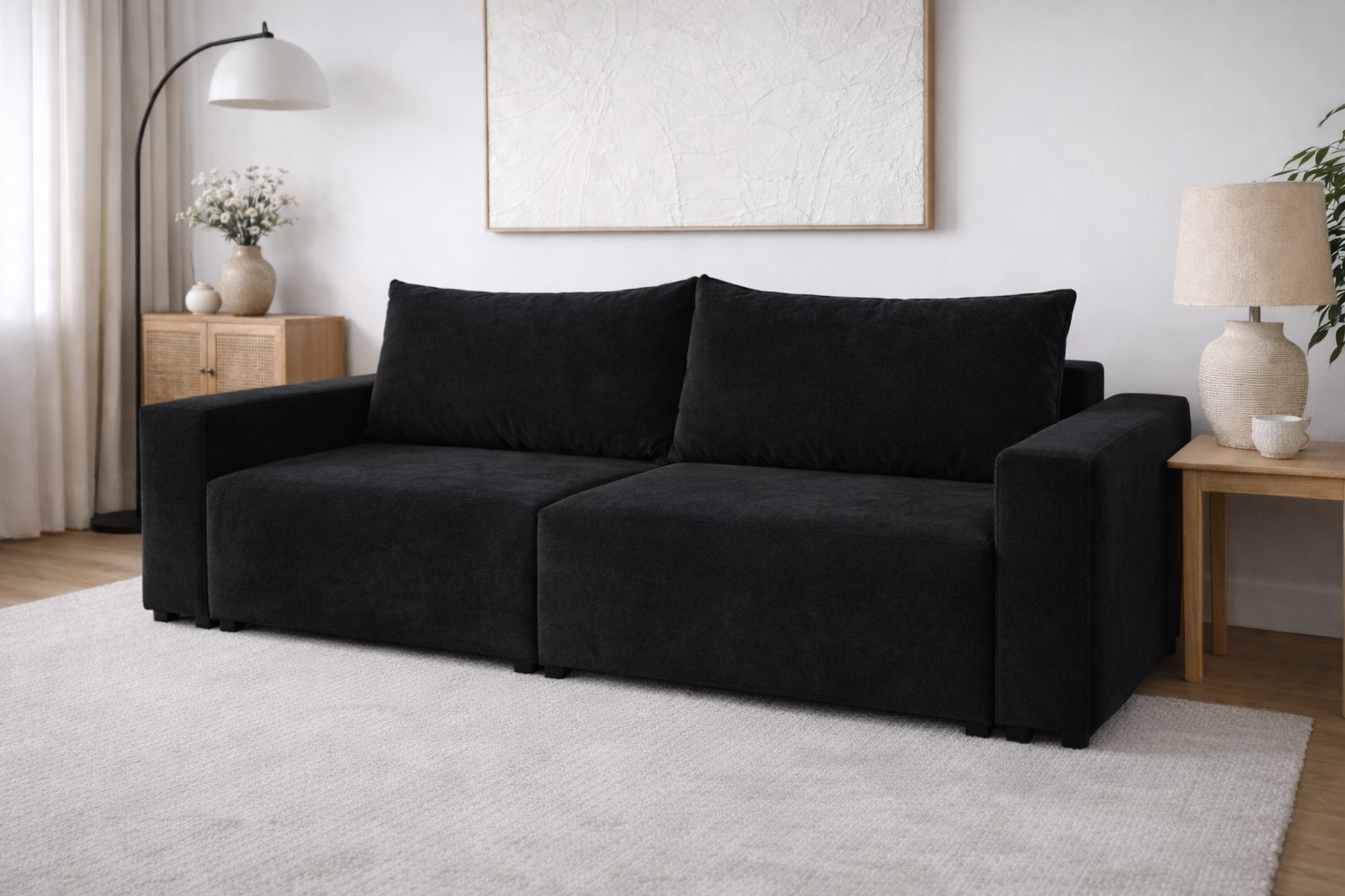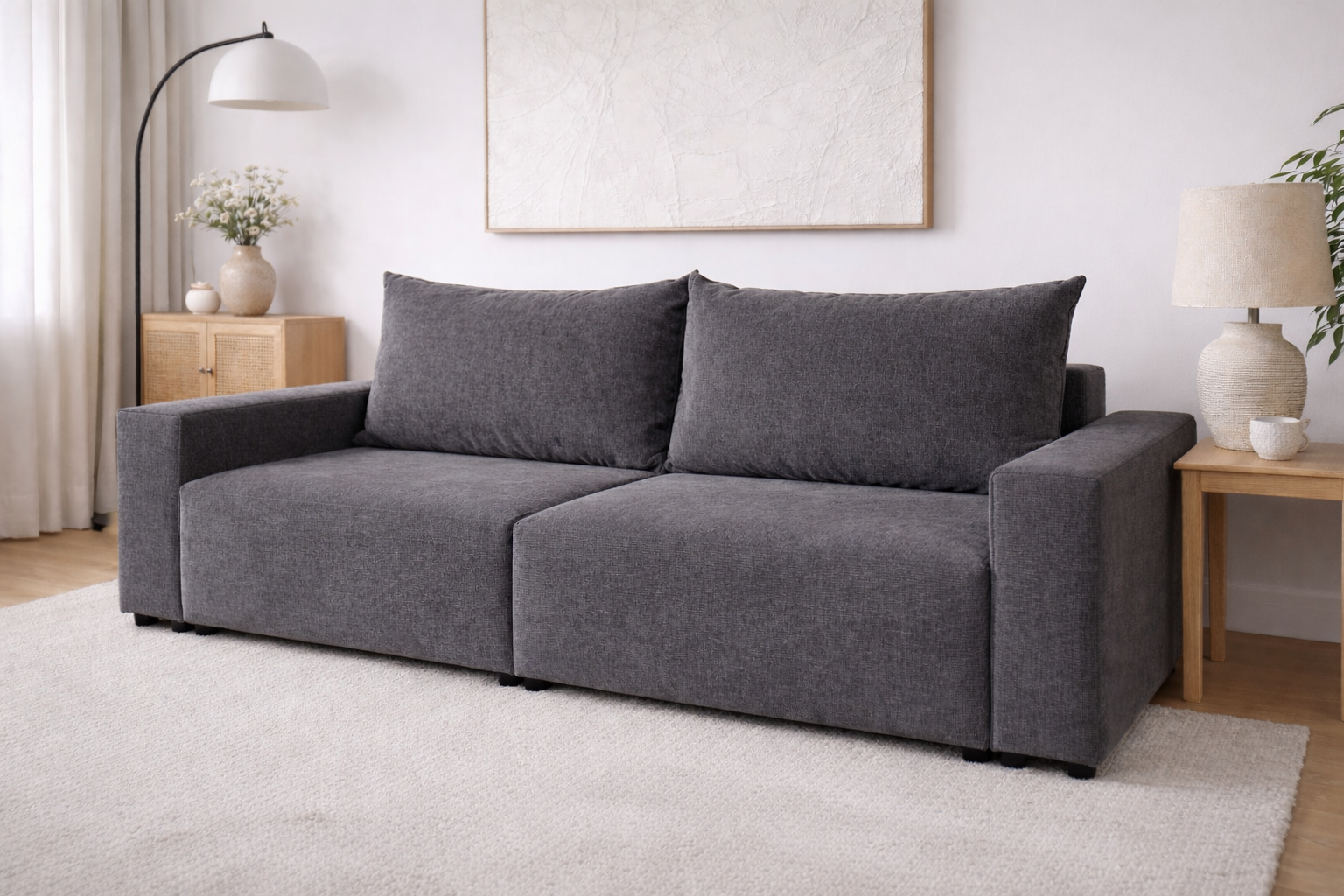 To nie tylko design, ale też wielozadaniowa sofa 3 osobowa z funkcją spania i pojemnikiem na pościel (posiada aż dwa schowki!). Mebel oferuje ogromną powierzchnię spania 222x155 cm. Codzienne użytkowanie ułatwiają niezależnie wysuwane siedziska (automat), a praktyczność zapewniają dwa pojemniki